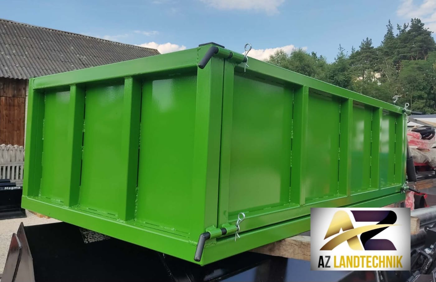 Stabile Transportbox für den Heckanbau am Traktor. Ideal zum Transport von Werkzeugen, Holz, Erde, Schüttgut oder anderen Materialien im landwirtschaftlichen Betrieb.